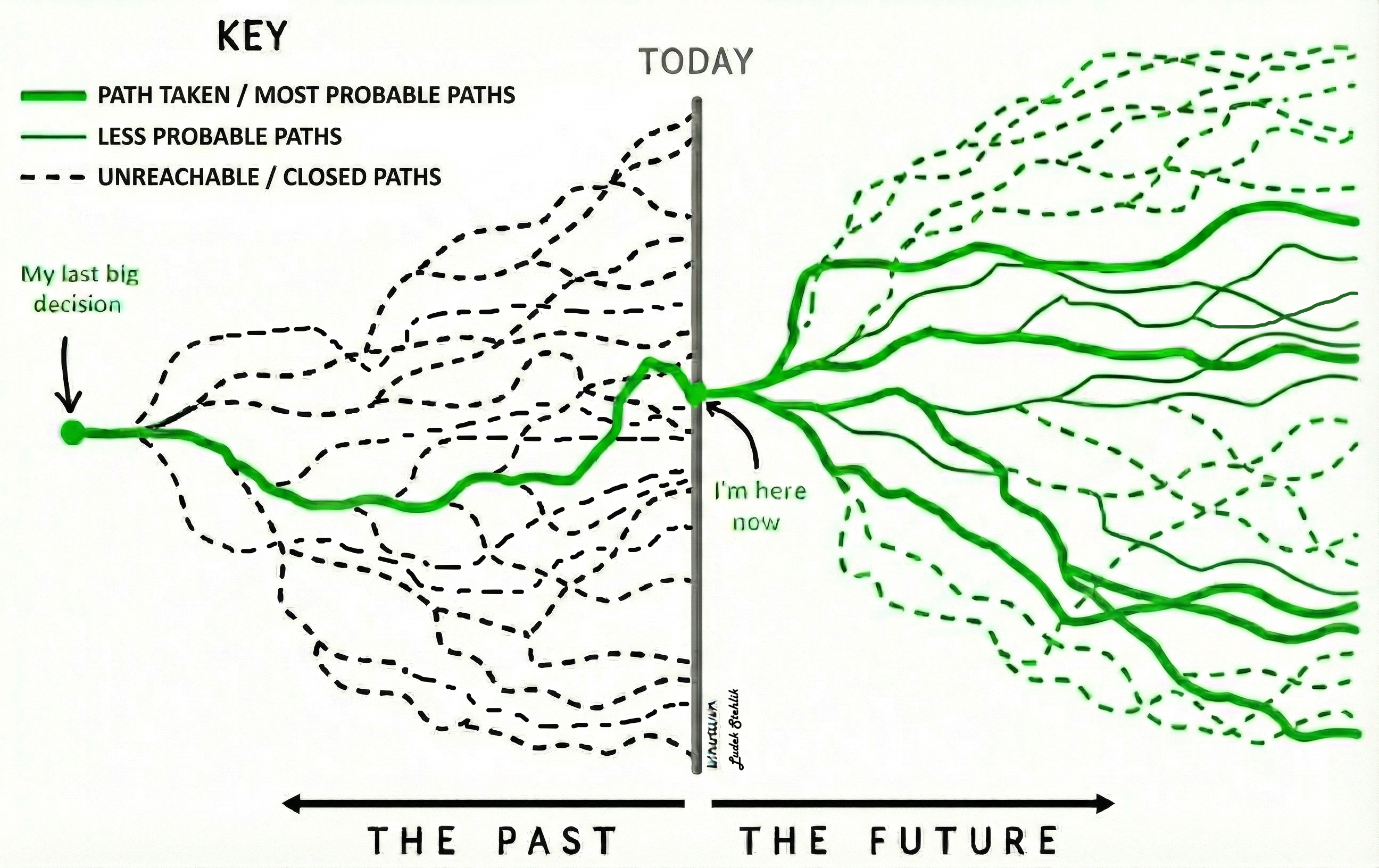 An updated look at the popular "Forking Paths" image to reflect probability and the reality of closed doors.