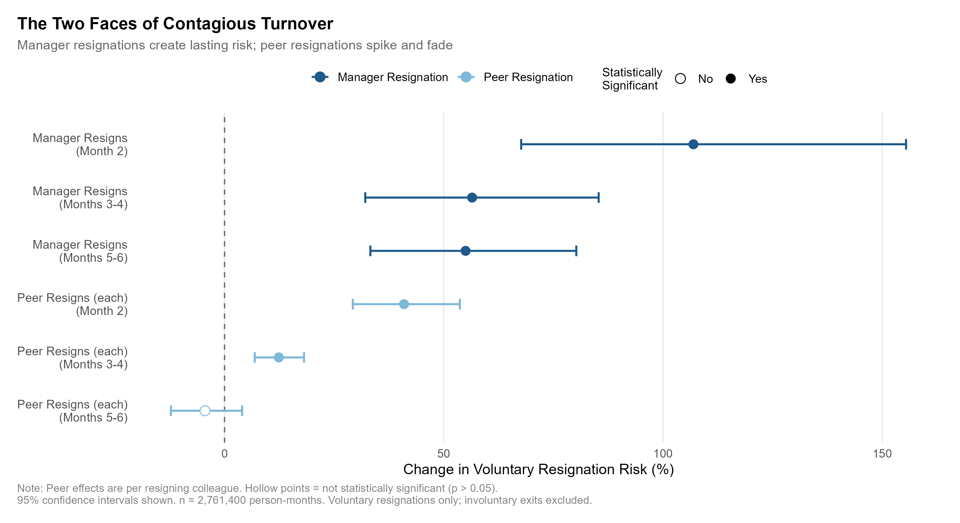 Recently, I dug into the well-known phenomenon of "contagious turnover" with real-world data in hand and found some compelling - and sobering - results. If you're curious about whose resignation is most strongly associated with subsequent departures (team peers or direct managers?) and whether team size can act as a buffer, continue reading.