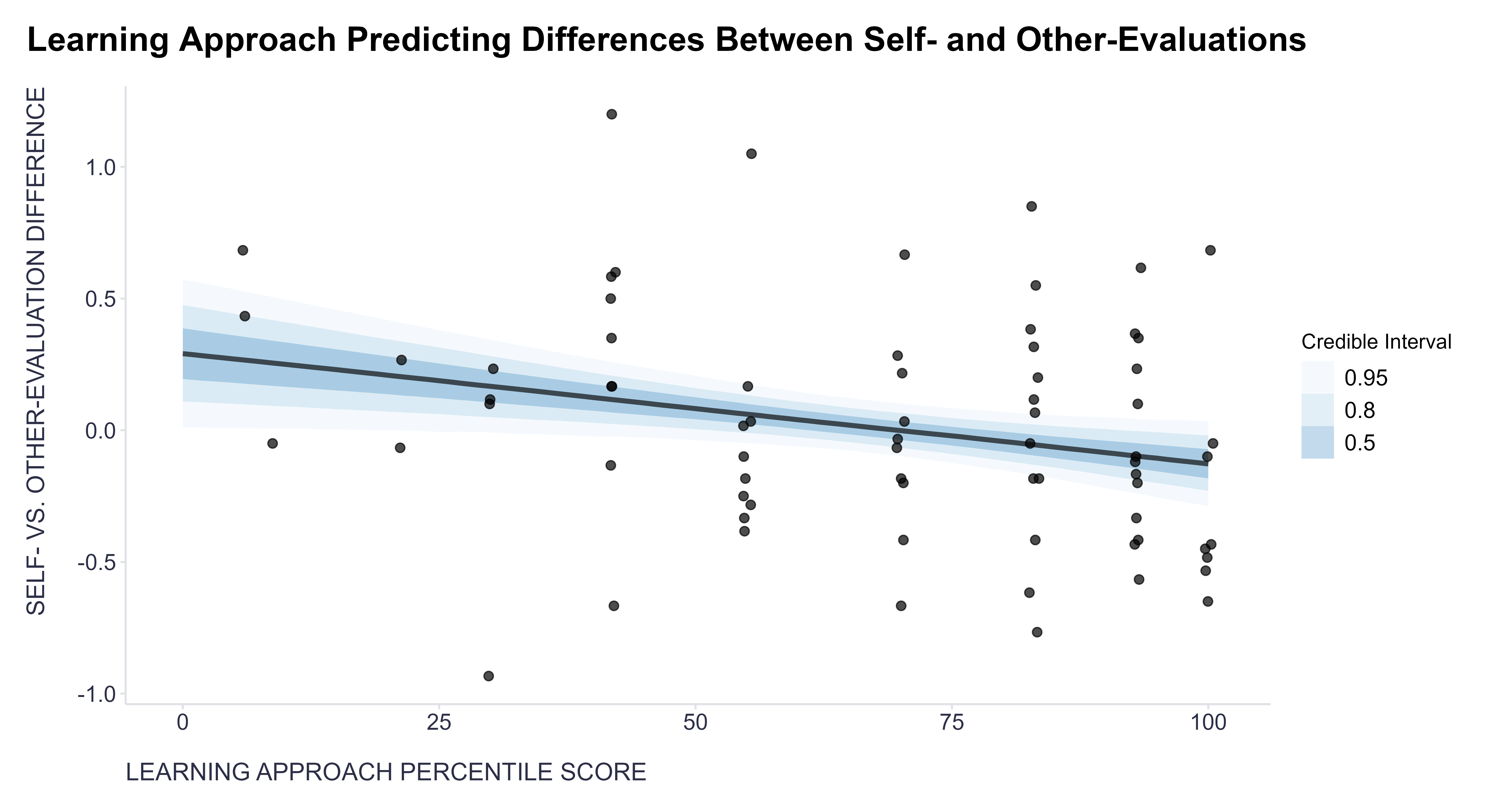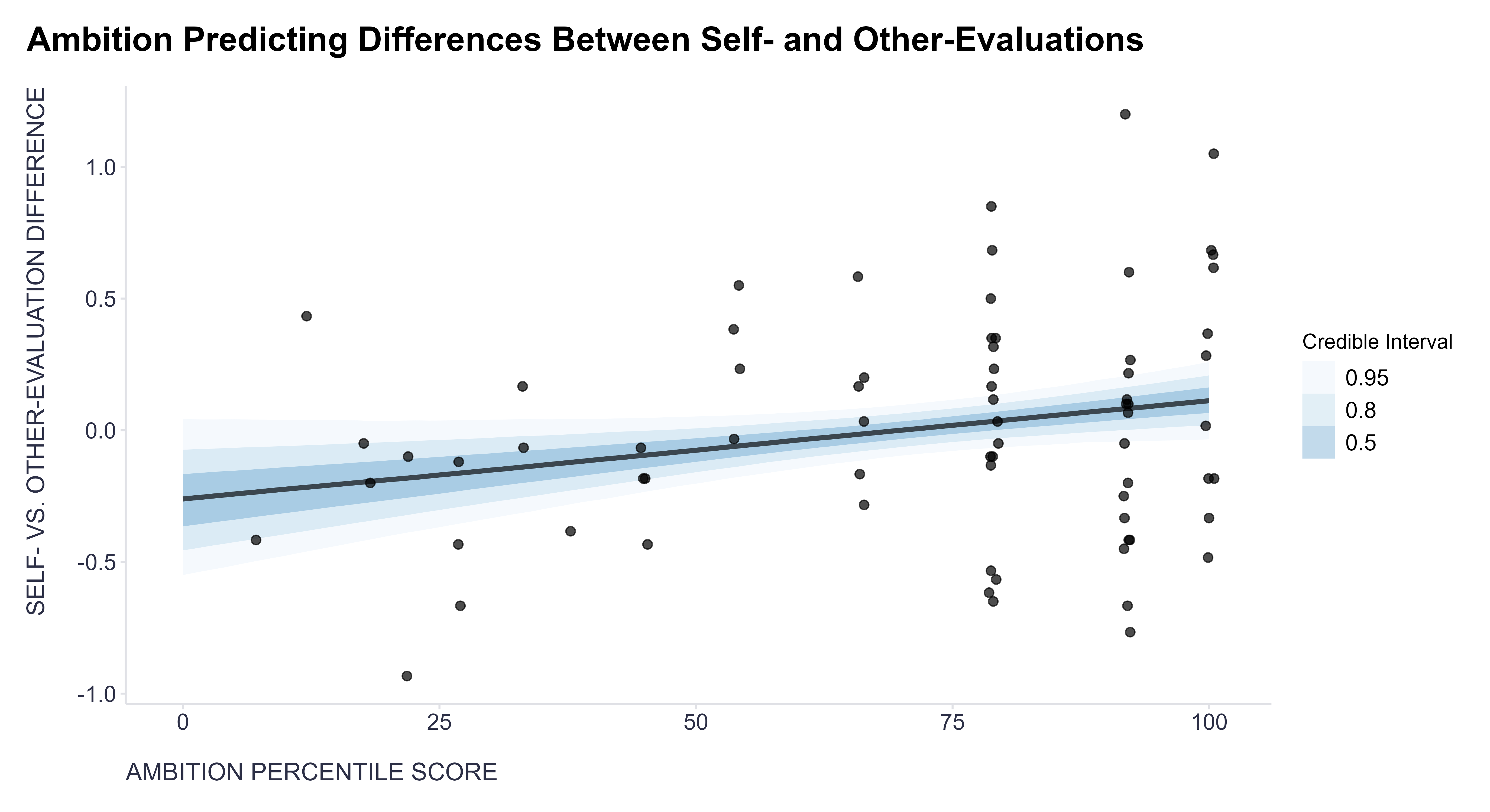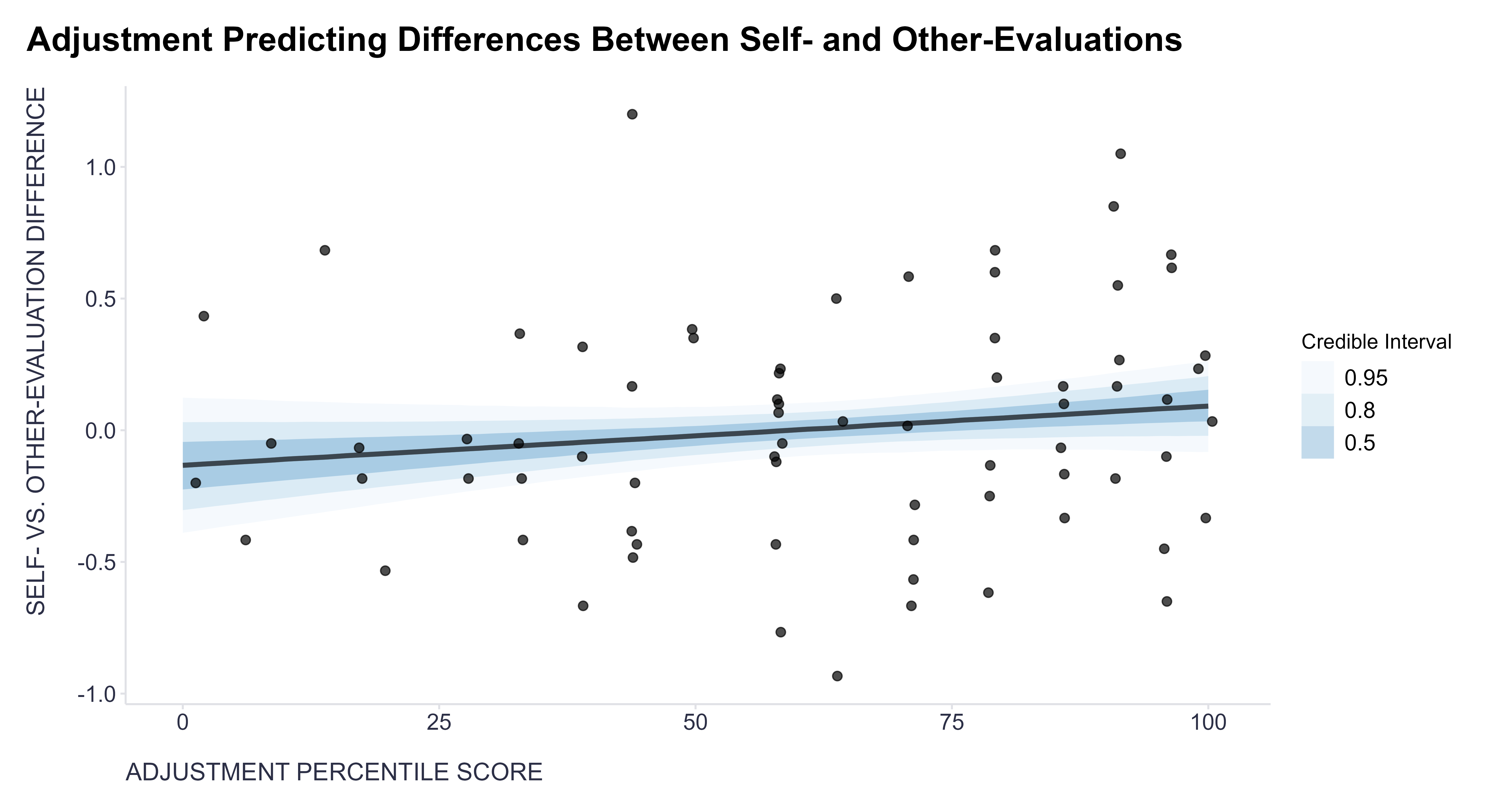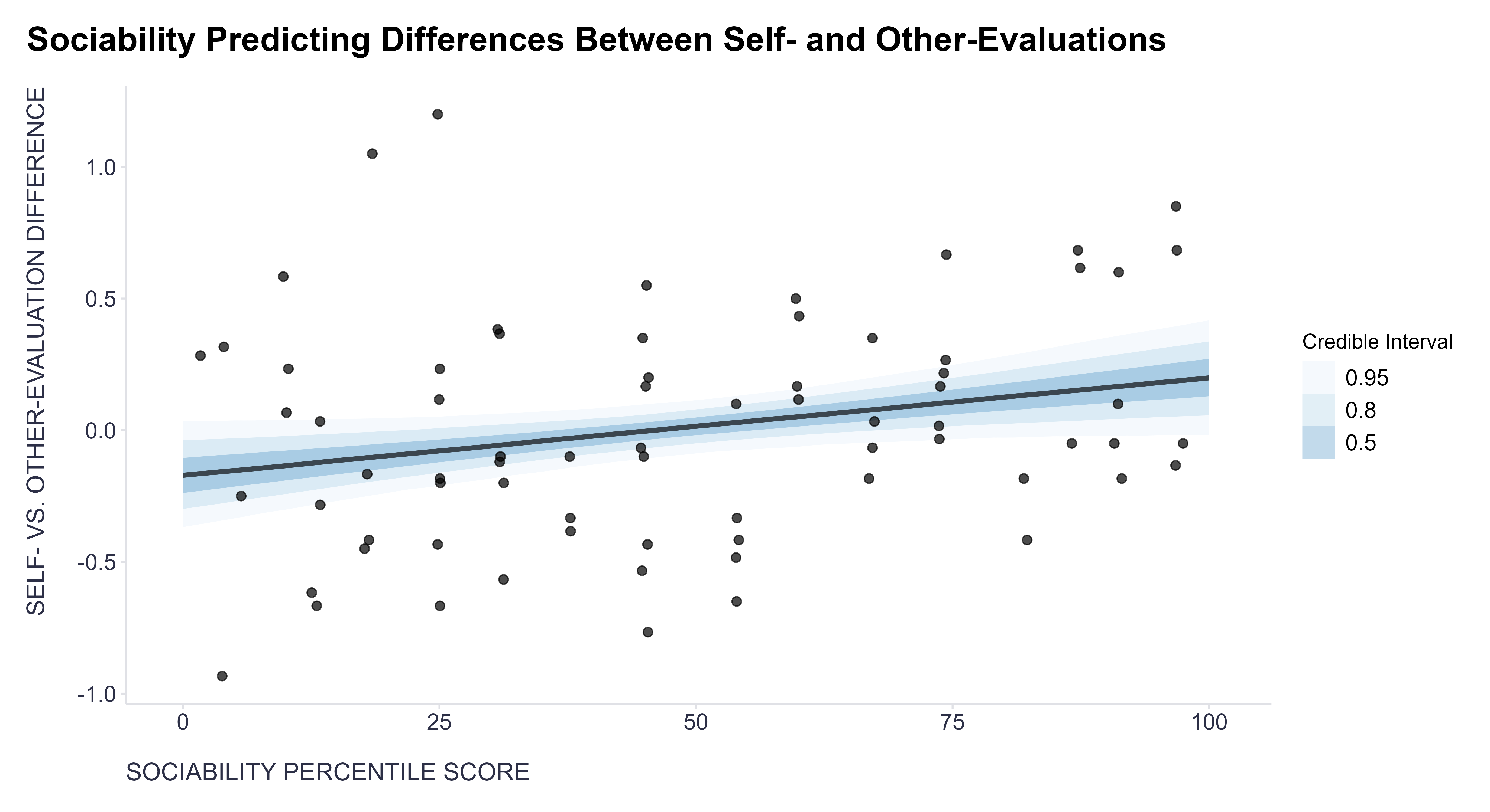 When modeling the relationship between the discrepancy in self-evaluation and evaluation by others and individual personality traits, I employed a generalized linear model with a Gaussian link function, and fitted it using the brms package for Bayesian modeling with its default priors. The results were as follows: