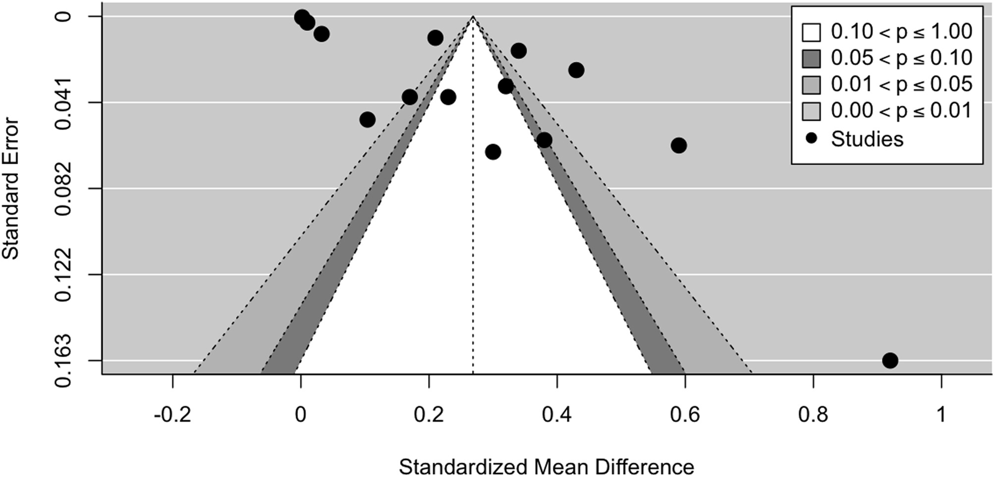 However, after correcting for publication bias (see the corresponding funnel plot below), the pooled effect is statistically indistinguishable from zero.